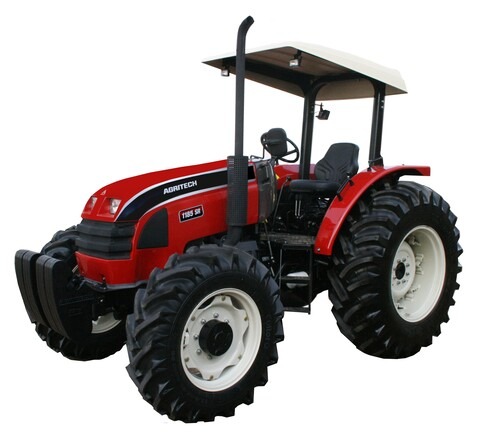 Trator Agritech modelo 1185 S tração 4 x 4, motor 4TNV98T TURBO – MAR I, de 82,0 cv , câmbio Sincronizado de 24 velocidades a frente e 24 a ré com reversor, tomada de força de 67cv, independente, standard, econômica e proporcional, capacidade de levante do hidráulico de 2.200 kg. Pneus dianteiros 250/80X18 e traseiros 14.9X24 Largura externa 1,43M.